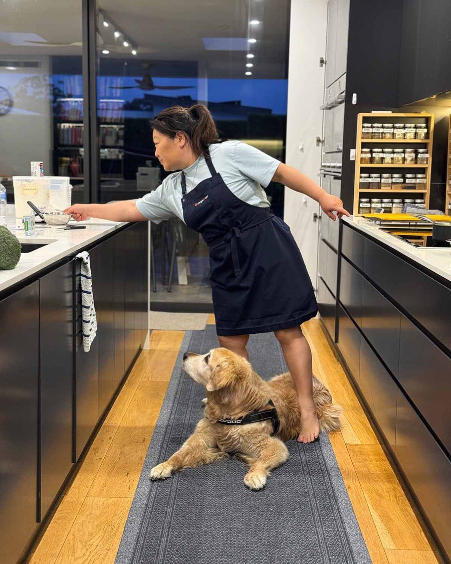 Everyday reality – trying to cook while Dozer parks himself exactly where I need to stand!