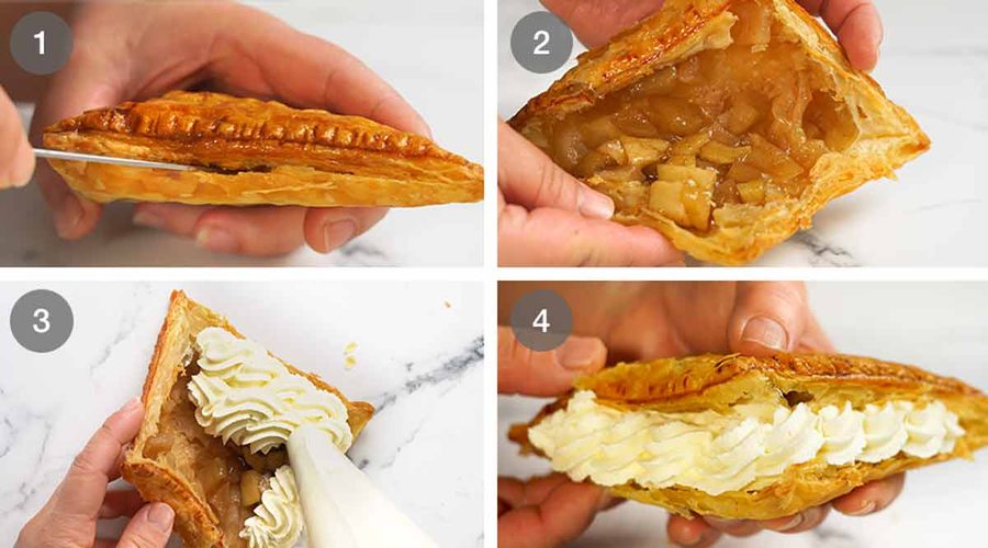 I had a lot of trouble getting the filling to stay inside the pastry the first time I tried. I found that draining the cooked apples through a sieve made them a lot easier to handle. I then used a syringe to inject the syrup into the sealed cases. Everyone loves them, better than the shop ones is the general consensus!