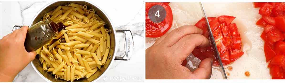 Chop tomatoes – Meanwhile, chop the tomatoes into 1 cm / 0.8″ squares, reserving all the watery juices (it becomes part of the pasta salad dressing). Don’t chop too small, else it becomes salsa-ish and becomes hard to eat with a fork.