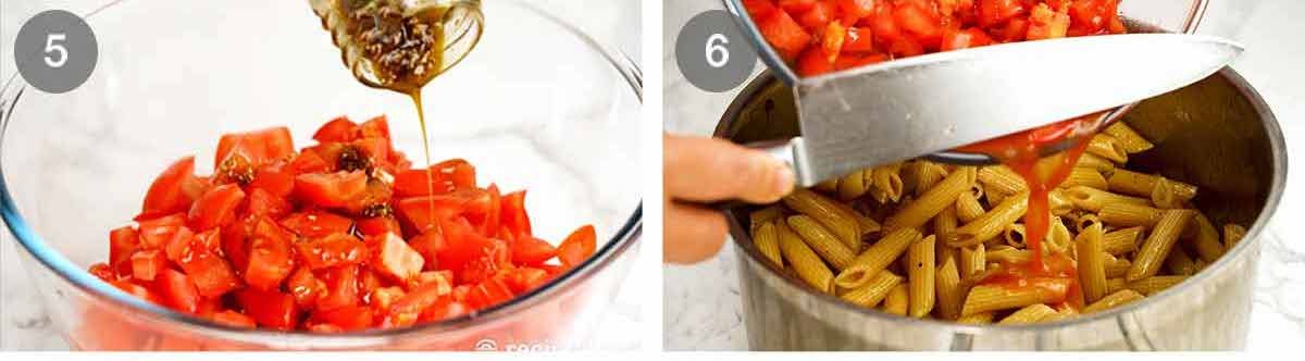 Toss cooked pasta and tomato (separately) with dressing, then leave for 10 – 15 minutes to absorb the flavour; then