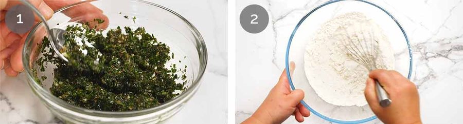 💡TIP: Instead of finely chopping the herbs with a knife, you can blitz it up with a stick blender. It makes it a bit finer and pesto-like so it is not quite as green once baked, but it works perfectly and is faster to make! Directions in recipe card notes.