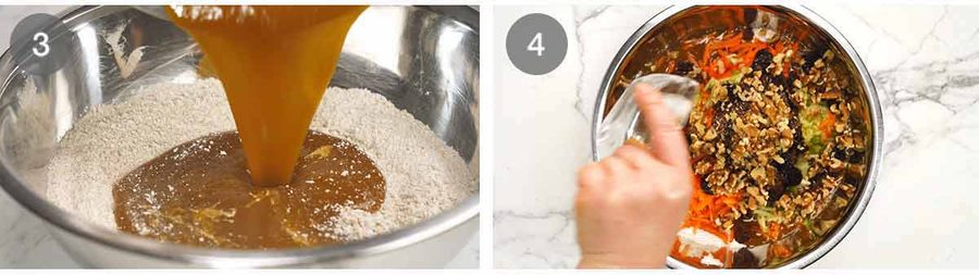 Add wet into dry – Pour the wet ingredients into the dry ingredients bowl.