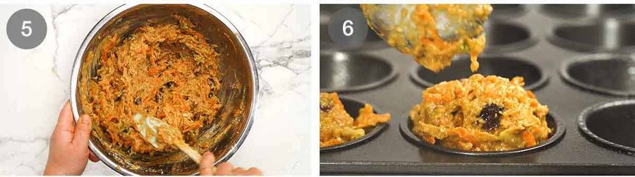 Mix with a rubber spatula just until you can no longer see flour. The mixture will be fairly thick, thick enough to stay in a mound in in the muffin tin (see step 6 photo).