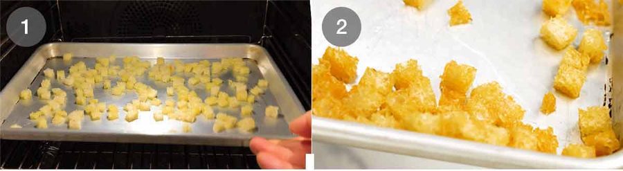 Croutons – Toss the bread cubes in a little oil and salt. Then bake for 8 – 10 minutes at 180°C/3450°F