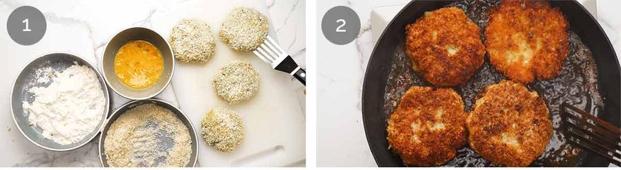 Flour – Working one ball at a time, coat in flour and shake off excess. Note: The mixture is quite soft so I find it’s easier for handling to do the dredging steps in ball form then press into pattiy shapes at the end.