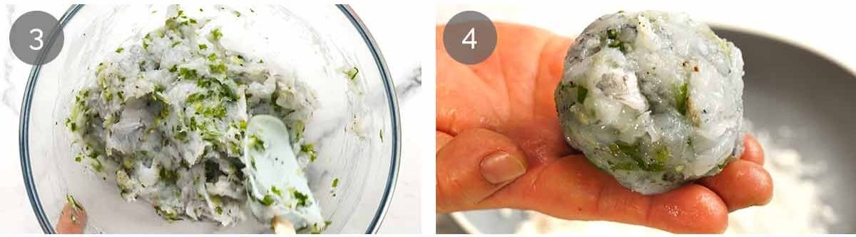 Prawn patty mixture – Scrape the prawn paste into a bowl and mix by hand with the remaining chopped prawns, green onion, salt and pepper.