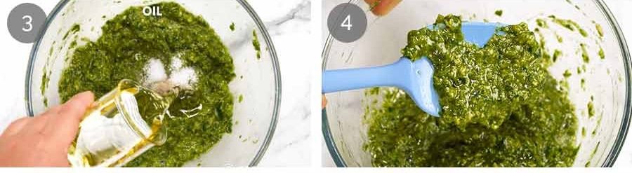 You need a lot – 4 to 5 big stems (ie with 3 or so stems on each stem). 4 cups once chopped into pieces that we then blitz. This is what makes this Asian pesto green!