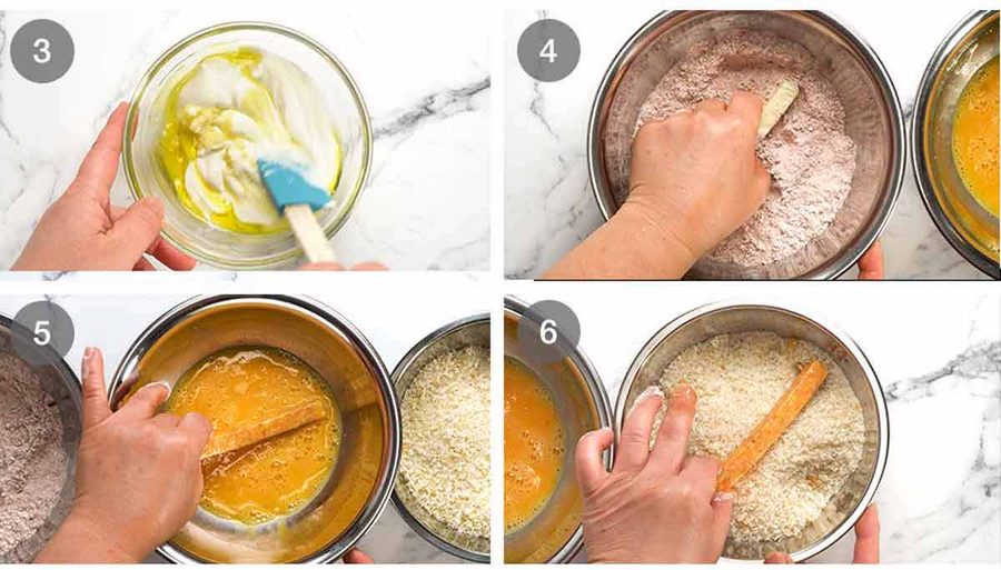 Use the same hand for the flour and egg, the the other hand for the panko. Less finger-mess.