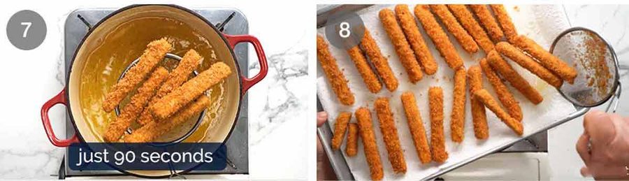 - Fry 5 haloumi sticks at a time for 1 1/2 minutes. Drain on a paper towel lined tray. Repeat with remaining haloumi.