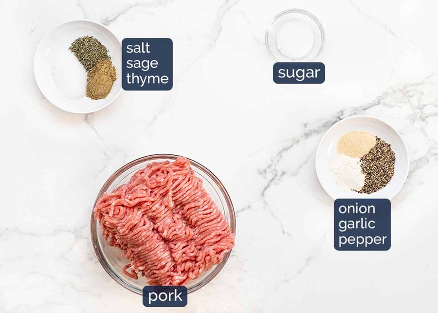 Here’s what you need to make these pork sausage patties. Pork is the best meat to use because it’s the softest and juiciest. However, the spice blend goes well with chicken and turkey too.
