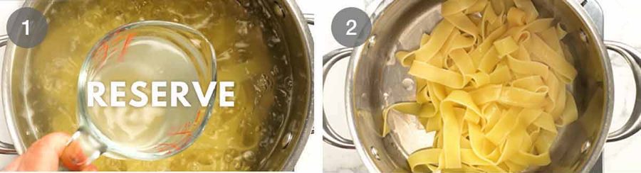 - Cook pasta – Cook the pappardelle according to the packet instructions. Just before draining, scoop out 1 1/2 cups of the cooking water and set it aside.
