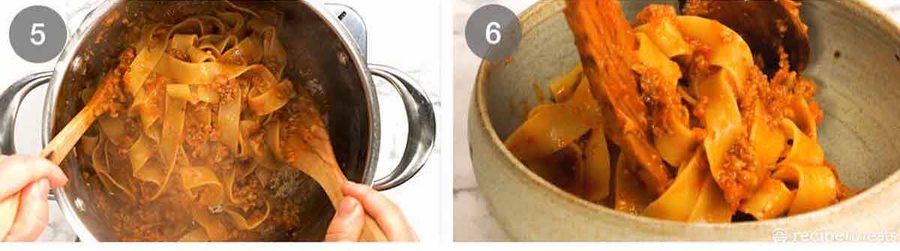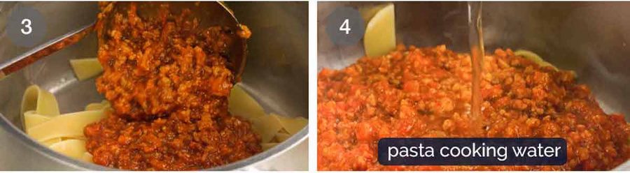- Toss with sauce – Have the ragu pot on the stove over medium heat. Add the pasta into the pot along with 1/2 cup of the pasta cook water. Use two spatulas to toss the pasta until the ragu is tangled in the pasta strands and it is stained red from the sauce. Use extra pasta cooking water if needed to loosen it up.