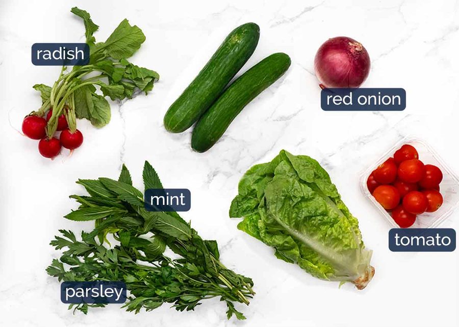 Being a traditional Lebanese dish, there’s actually no strict rules for what goes in fattoush, though the combination shown below is popular and provides a great contrast of colours and textures.
