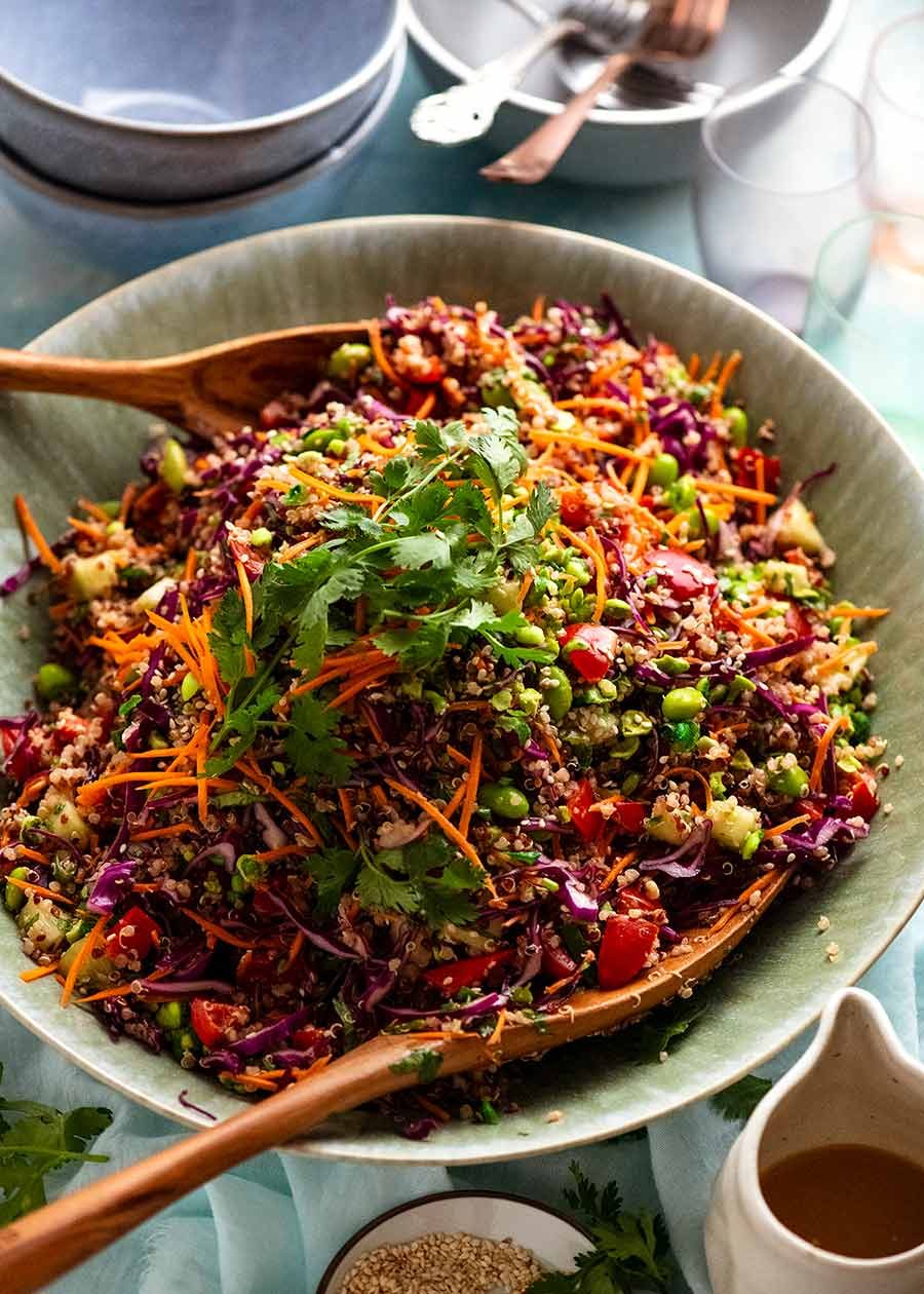 Not a quinoa fan but this rocked my boat that its now a repeat salad! I had no red cabbage so did white, also forgot the green onions and was still delicious. The nutty dressing was drink off the plate divine.
