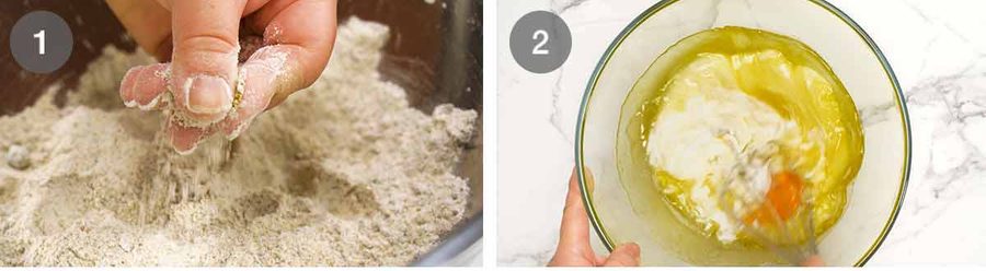 Whisk wet – Put all the wet ingredients into a separate medium bowl. Then whisk until combined.