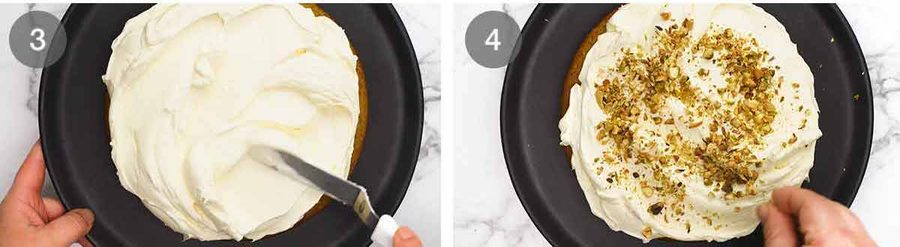 - Spread the cake with the Cream Cheese Whip (steps below). Sprinkle with chopped pistachios. Cut and eat!