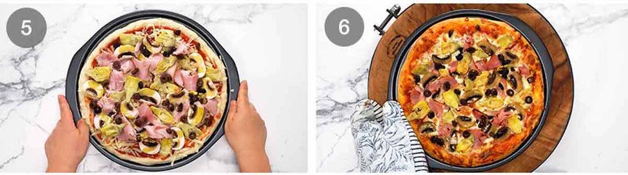 - Top – Spread the pizza sauce on the pizza, leaving a 1 cm/1/2" border along the edge. Sprinkle with cheese first, then drape the ham randomly across the surface, sprinkle with olives, artichoke slices and mushrooms. (If using the no-yeast pizza base, spray/brush exposed crust with olive oil.)