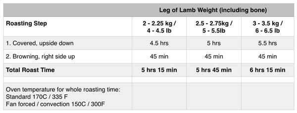 - Season leg with salt and pepper, place upside down on garlic, onion and rosemary. Pour liquids in, drizzle with oil, cover with foil. Roast 4 1/2 hours at 170°C/335°F (150°C fan) until meat is pull-apart tender. Flip, return to oven 20 – 30 minutes at 200°C/390°F (180° fan) until well browned. Make gravy while resting.