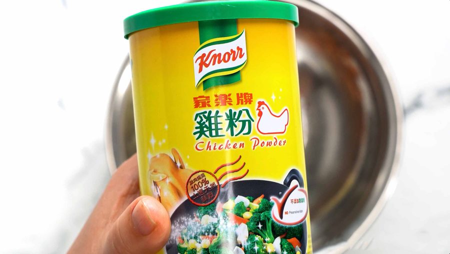 I use Knorr brand, yellow can with a green lid. Get it at any Asian grocery store here in Australia, it’s so common, and good value, a little bit goes far. Substitute with any regular chicken stock powder, or crumbled bouillon cube.