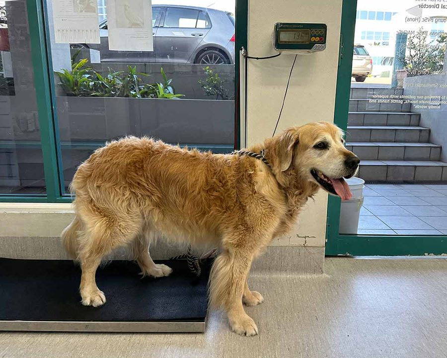 Dozer going for his first weigh in at his new vet! Who do you think taught him that trick of hanging half off the scales…..