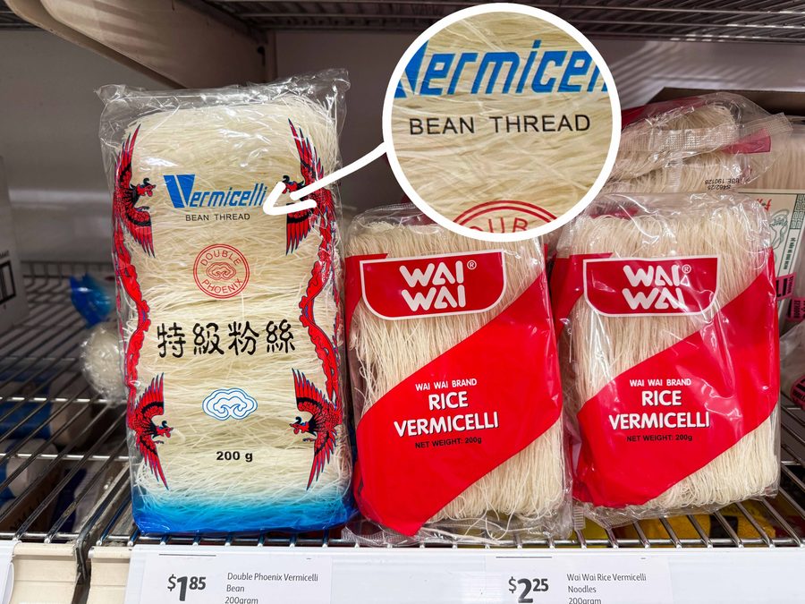 But actually, they are different. Similar neutral flavour but glass noodles are transparent (hence the name), slippery, chewy and made of mung bean starch. Rice vermicelli are white, not slippery, break more easily and made of (you guessed it) rice!