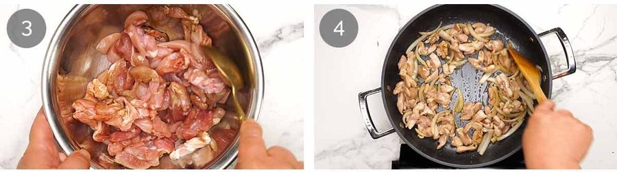 - Cook chicken and onion – Heat 2 tablespoons of the oil in a large 30cm/12" non-stick pan over high heat until very hot (see Note 5 if your pan is smaller). Add onion and stir for 15 seconds. Add chicken and stir for 2 minutes until almost cooked through.