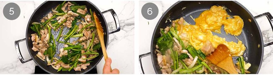 Scramble eggs on side (classic Thai) – Push everything to one side and add a small drizzle of oil into the cleared space. Pour the eggs in and gently stir to scramble. When the egg is mostly but not completely cooked, mix it into the chicken.