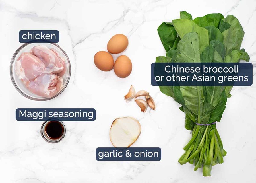 - Mix sauce, toss chicken in Maggi. In 30cm/12" pan, cook onion 15 sec, cook chicken ~ 2 min, adding Chinese broccoli stems and garlic towards end. Push everything to side, drizzle oil, scramble eggs, mix everything together. Add Chinese broccoli leaves, noodles, sauce, toss well. Serve!