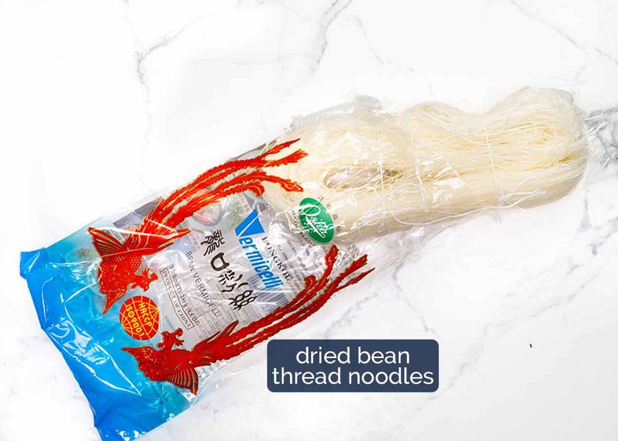The proper name is “bean thread noodles” which is the name on the label, but I don’t know anyone who calls it that! I always hear it referred to as glass noodles, and sometimes cellophane noodles, because they are transparent once hydrated.