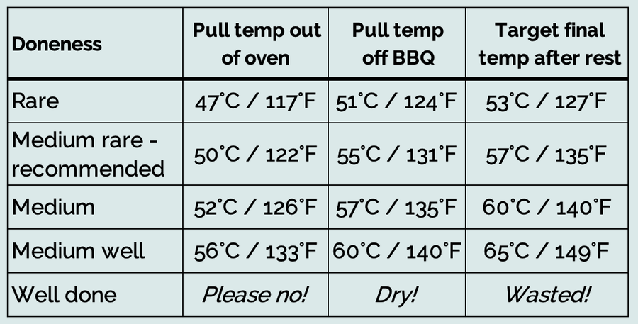 The Target Temp is the final internal temperature for each level of doneness. The Pull Temp is the temperature at which the beef should be pulled out of the oven, then off the BBQ. It will rise to the Target Temp after resting for 10 minutes.