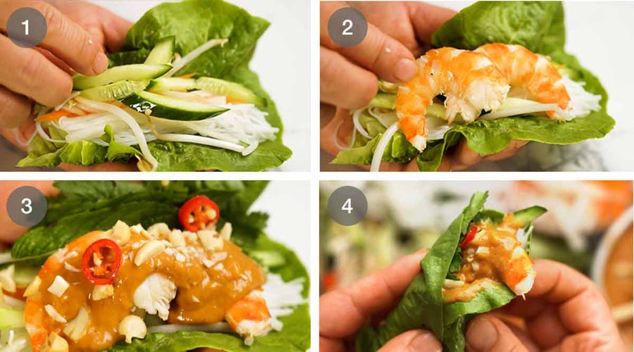 - Assemble – Here's my order: lettuce leaf, noodles first, then veg* (carrots, bean sprouts etc), prawns, stuff herbs down the side, drizzle with sauce, sprinkle with peanuts and chilli. Bundle and bite!