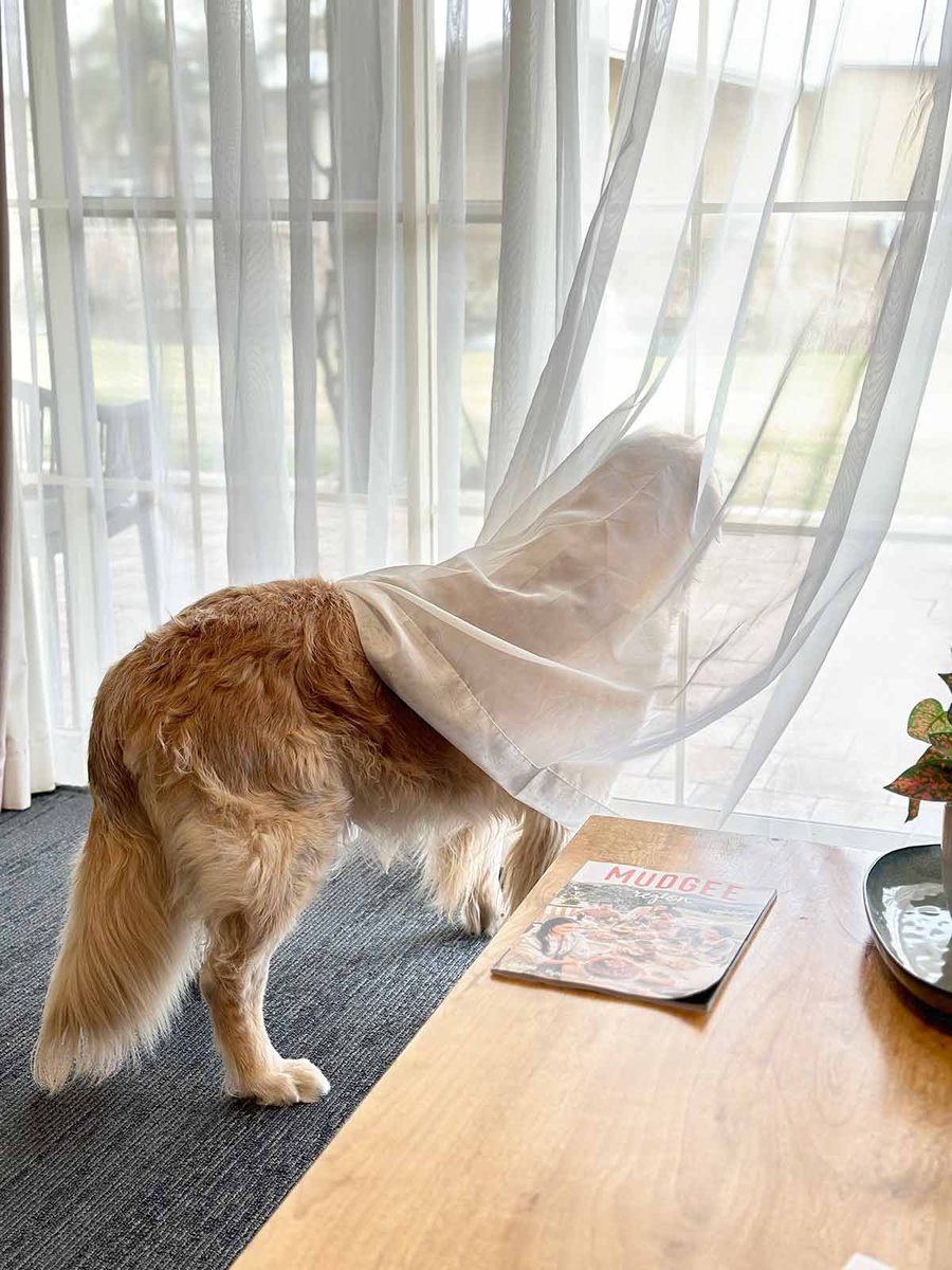 I have no cute photos of Dozer in the streets of this quaint country town because it’s raining today. This is what he’s been doing in the hotel room pretty much since we got here – staring at the ducks outside. 😂
